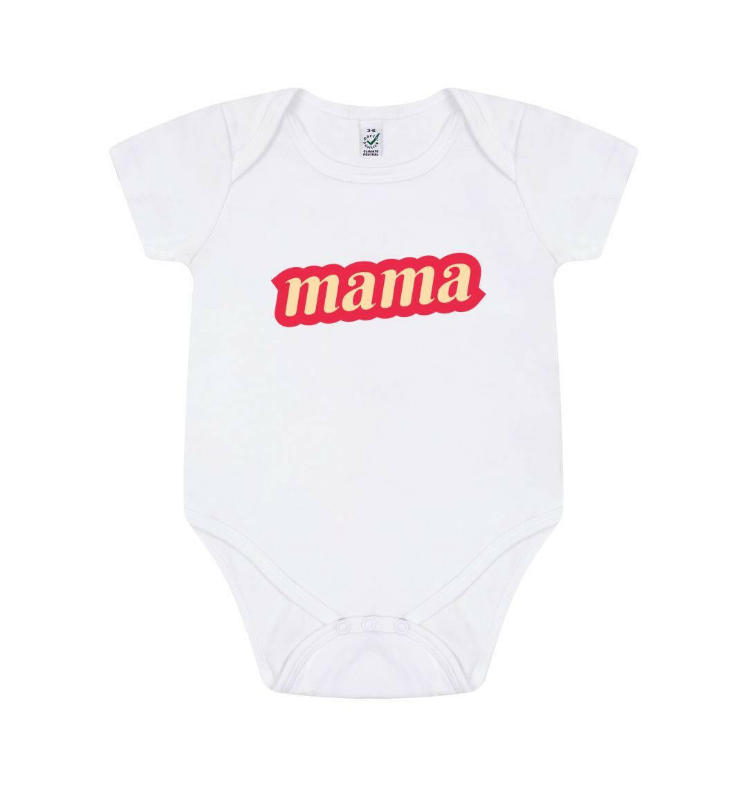 This ‘Mama’ baby grow is made on super-soft organic cotton. Feels great and good for the babies skin.