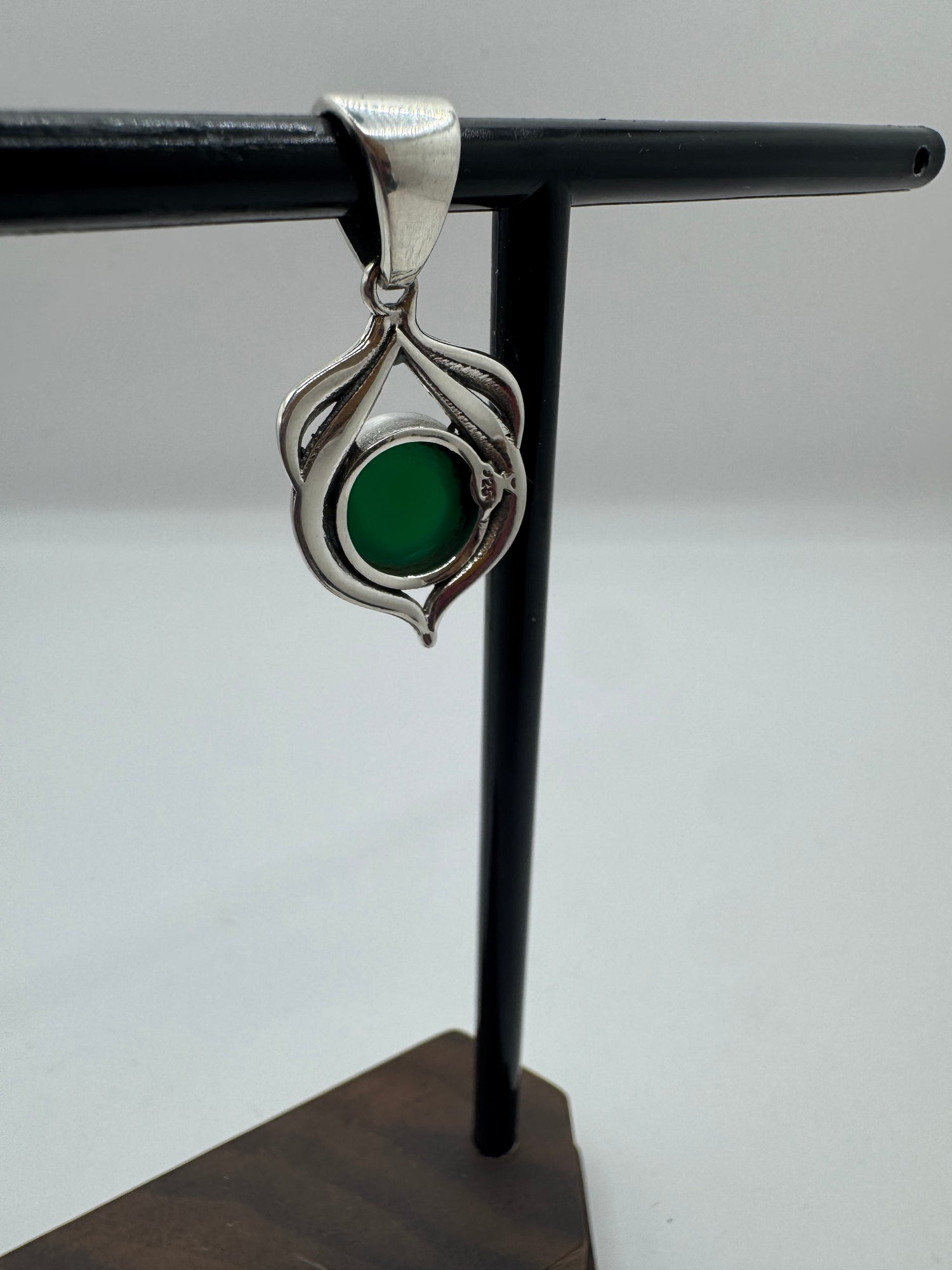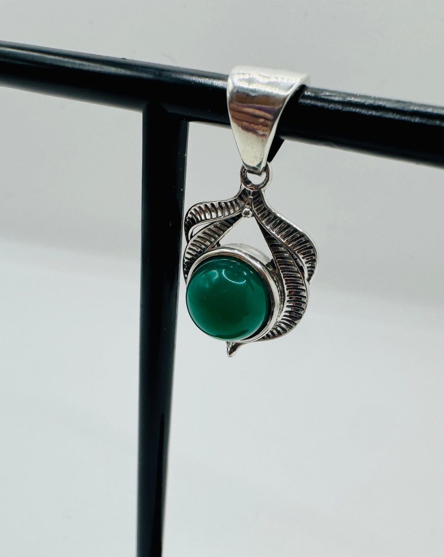 Unit price perThis handcrafted 925 sterling silver pendant features a deep green onyx gemstone framed by intricate oxidised silver detailing, creating a timeless balance of texture and color. Known for its calming and grounding energy, green onyx adds a soulful depth, while the oxidised finish gives the piece a vintage, artisanal charm. Perfect as a standalone statement or layered for effortless swagger. Handmade with intention. Worn with confidence.