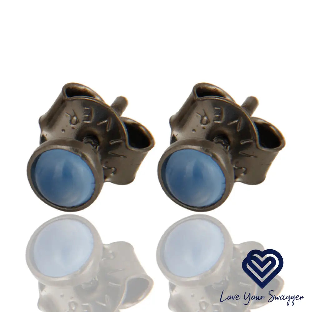 Unit price perEach stud features a captivating blue chalcedony gemstone delicately encased in a sleek black rhodium plating on sterling silver bezel setting. The rich hue of the gemstone exudes tranquility and charm, while the black sterling silver frame adds a contemporary edge, creating a timeless yet modern aesthetic.